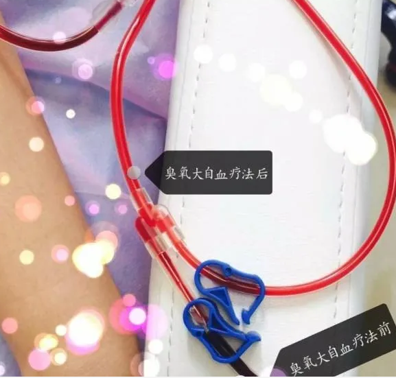 臭氧大自血治疗后,可以直观的观察到血液颜色的变化,在血液里混合了医疗用臭氧,细胞的抗氧化力受到刺激,生成扩张血管的物质。血液由暗红色变为鲜艳的红色。