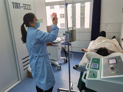 取治疗者的一部分静脉血注入带有抗凝剂的臭氧耗材中,然后再注射等比例的臭氧-医用氧气混合气(治疗浓度一般选择20-50ug/ml,与血量等体积)。沿同一时针方向晃动血液3-5分钟,然后把血液重新回输到患者体内。溶解在血液中的臭氧量可以用气体的体积乘以医用臭氧的浓度计算出来。一般情况下,一个疗程10次。